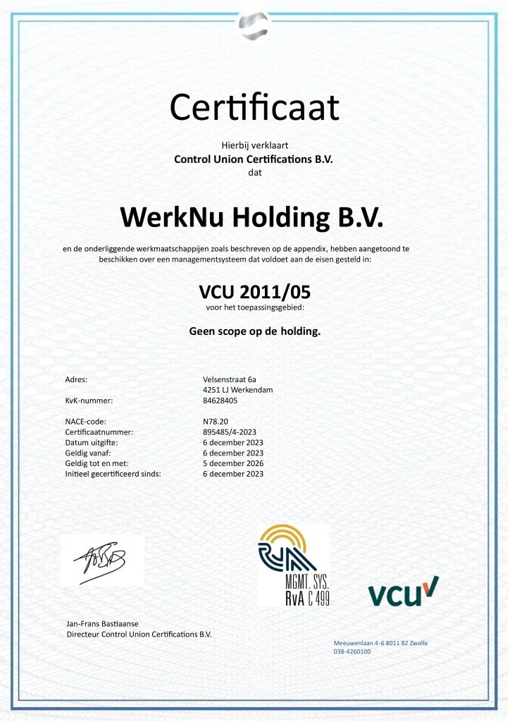 Wij vinden het belangrijk dat onze mensen veilig en gezond werken. Met de VCU-certificering tonen we aan dat we op het gebied van veiligheid en gezondheid niets aan het toeval overlaten. Dat betekent bijvoorbeeld dat we wet- en regelgeving kennen, dat we gevaarlijke situaties herkennen en dat we weten hoe je die kunt voorkomen. Door onze VCU-certificering kunnen wij flexibel personeel beschikbaar stellen aan technische bedrijven die VCA-gecertificeerd zijn.