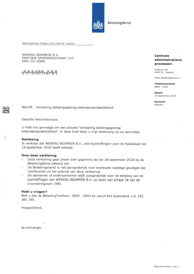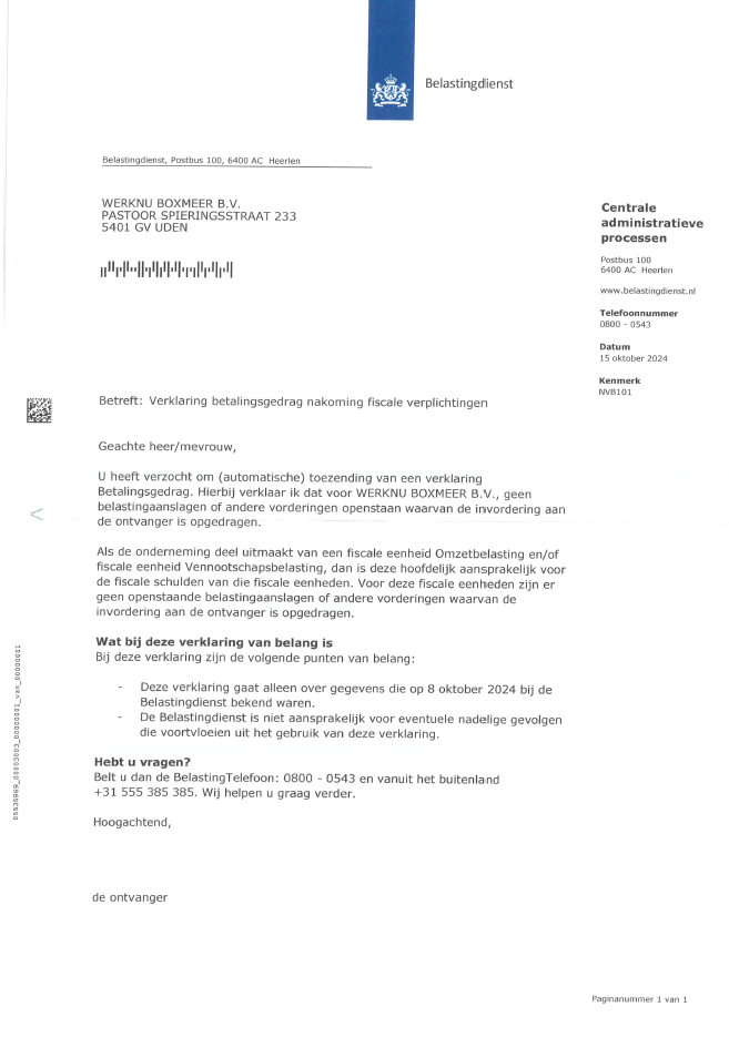 WerkNu voldoet aan haar betalingsverplichtingen aan de Belastingdienst. Hiernaast vind je de verklaring betalingsgedrag van WerkNu.